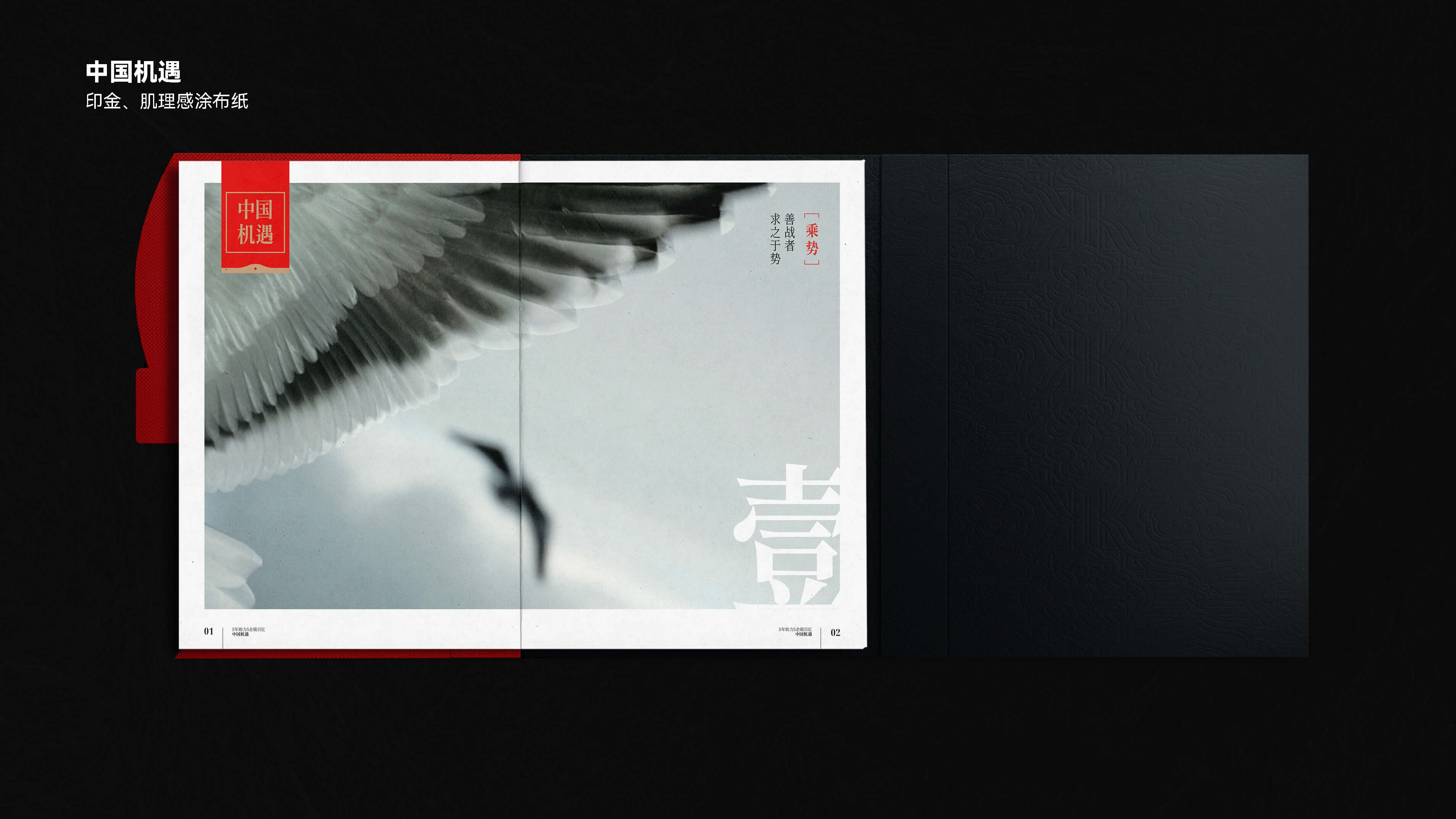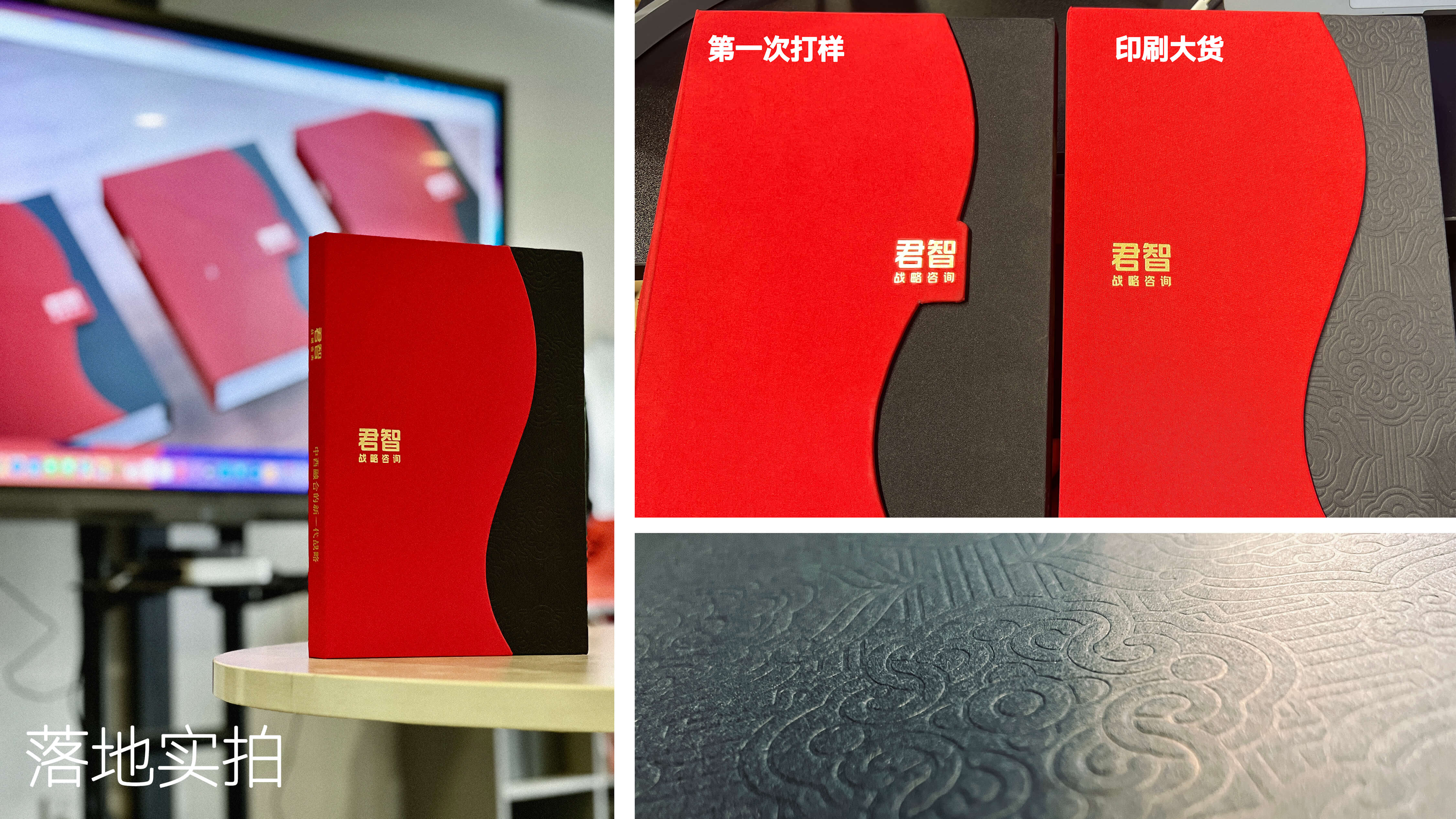 {装帧与工艺表现} 在书籍装帧上使用了复合型磁吸双开的结构,红色部分选用布料材质,黑色部分使用“粗糙、质朴的”未涂布肌理特种纸压印暗纹,结合使册中册(宣纸)、拉页(宣纸)、专红、烫金工艺,成功将中国美学融于其间,展现出君智作为中国战略公司的中国哲思。
